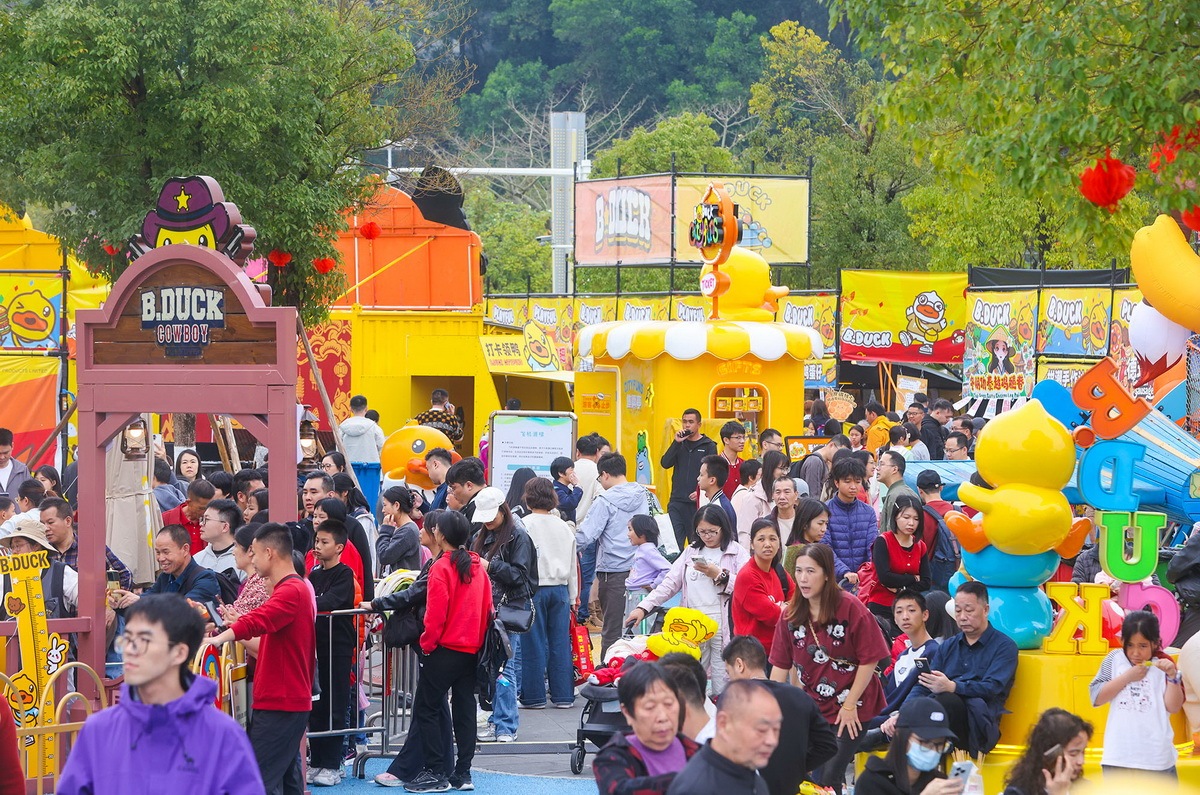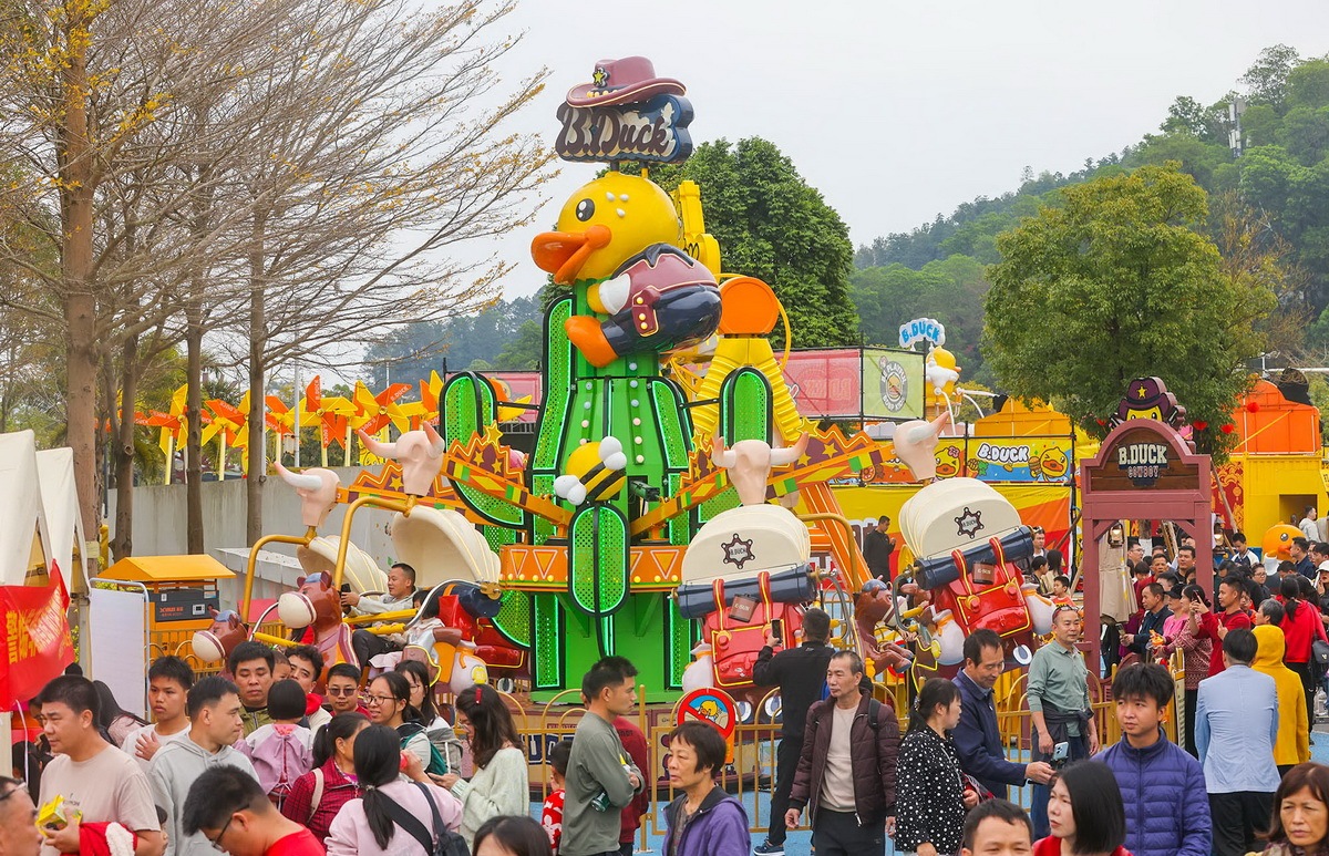 这只国民大IP萌鸭携巨型趴趴鸭、环球美食集市、亲子工坊等十余项体验项目亮相,为中山市民献上一场春日欢乐派对。孩子们在萌鸭造型的游乐设施间穿梭嬉戏,家长们则在一旁拍照打卡、品尝美食,共同在浓浓年味中感受童趣与温暖。