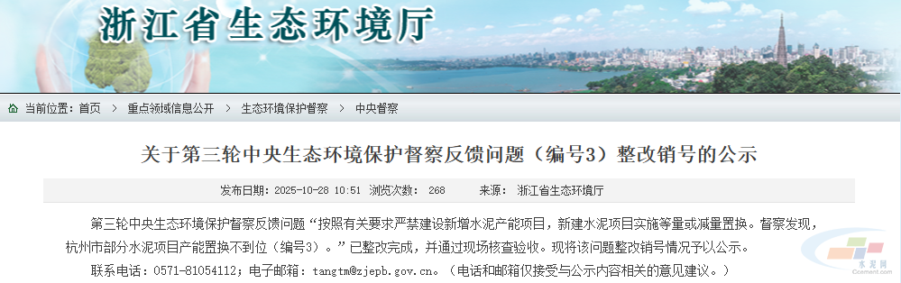 10月28日,浙江省生态环境厅发布关于第三轮中央生态环境保护督察反馈问题(编号3)整改销号的公示。公示日期为2025年10月29日至2025年11月11日。